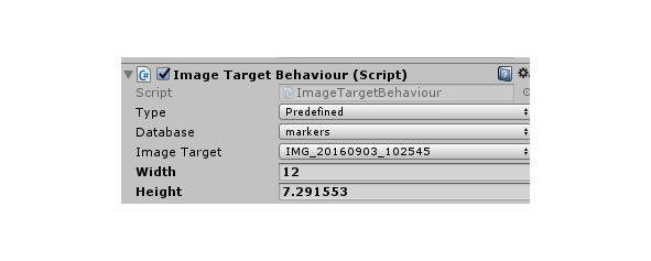 В свойствах Image Target в окне Inspector в разделе Image Target Behaviour в поле Database выберем импортированную базу маркеров и увидим наше изображение в сцене.
