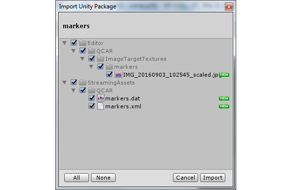 С помощью кнопки Download Database скачайте базу маркеров и дважды кликните на скачанном Unity пакете. Импортируйте маркеры в Unity проект.