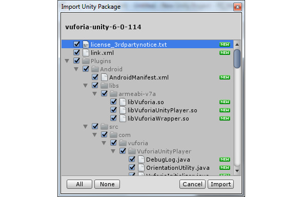 Загрузите Vuforia Unity Extension и дважды кликните на файле *.unitypackage. При открытии Unity, выберете созданный проект. Импортируйте Vuforia Unity Extension в проект.