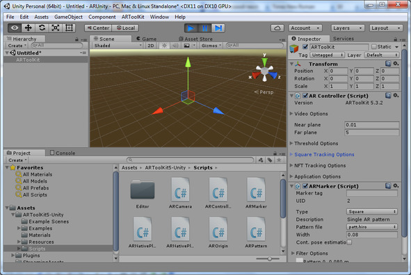Этот объект будет содержать два AR конфигурационных объекта ARController и ARMarker. Поэтому перетащим их из папки Scripts в объект ARToolKit.