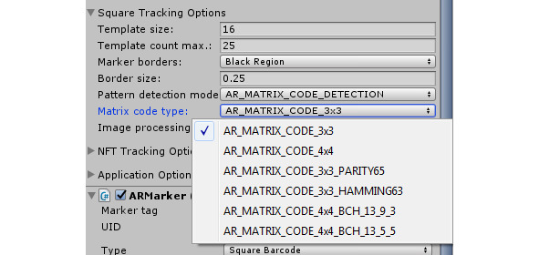 Для использования маркера Square Barcode в свойствах ARController скрипта в разделе Square tracking options в поле Pattern detection mode выберем AR_MATRIX_CODE_DETECTION, а в поле Matrix Code Type выберем тип набора маркеров.