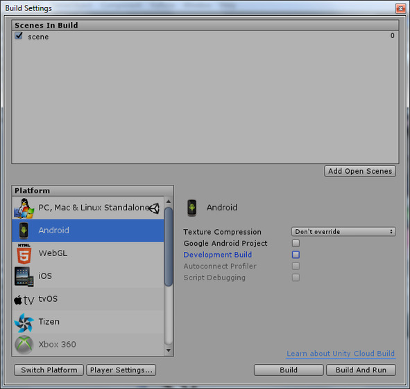 Соберем Unity проект в виде приложения для Android устройства. Для этого в меню File выберем Build Settings, выберем платформу Android и кнопкой Add Open Scenes добавим созданную сцену.