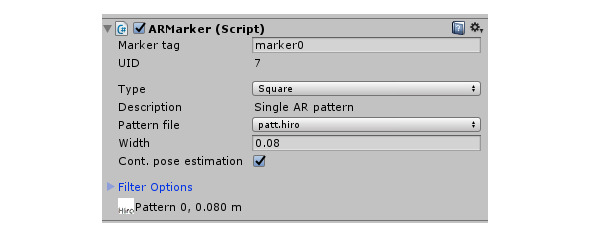 ARMarker скрипт обеспечивает маркер отслеживания, к которому прикрепляется 3D модель. В поле Marker tag введем идентификатор маркера.