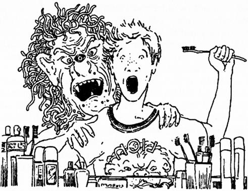 Я стоял в ванной и чистил зубы занятие не самое приятное, но успокаивающее. Когда чистишь зубы, как-то забываешь обо всем остальном. Представьте себе мой испуг, когда в зеркале рядом с моим лицом вдруг отразилась жуткая зеленая физиономия!