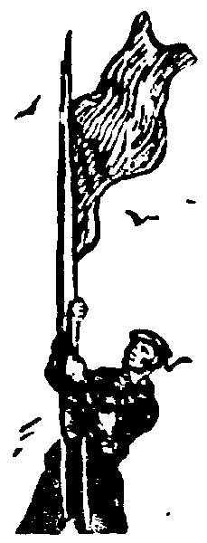 Липатов снимает с древка, взятого у сторожа, лоскут кумача и крепчайшим морским узлом привязывает его к фалам грот-мачты.