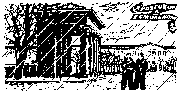 Они минуют цепь вооруженных рабочих и солдат, охраняющих на перекрестке подступы к Смольному институту, в здании которого находится Военно-революционный комитет, и вскоре сливаются с толпой у ворот главного входа, там, где над непрерывным потоком людей реют кумачовые полотнища с лозунгами партии большевиков: