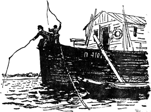 «Купец» пришёл уже в огнях. Мы хотели прыгнуть с конторки на нос парохода, но показалось слишком высоко. Тогда мы пробрались к корме. Только что мы спустили ноги за конторку, как вдруг появился усатый матрос вешать фонарь на мачту. Свет фонаря упал прямо на нас, и матрос заорал так, будто поймал мошенников: