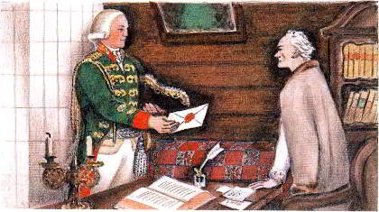 Но императрица умерла, и царствовать стал её сын Павел Первый, человек вспыльчивый и гневливый по пустякам. Он узнал, что Суворов недоволен новыми порядками в армии, да ещё изволил смеяться над ним, императором И Павел сослал полководца в Кончанское. А в приказе по войскам повелел написать: «Фельдмаршал граф Суворов, так как войны нет и делать ему нечего, отставляется от службы».