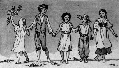 Высокий человек в кожаном переднике, с голыми огромными руками, держит на плече девочку лет шести, серенькую, точно мышь, и говорит женщине, идущей рядом с ним, ведя за руку мальчугана, рыжего, как огонь: