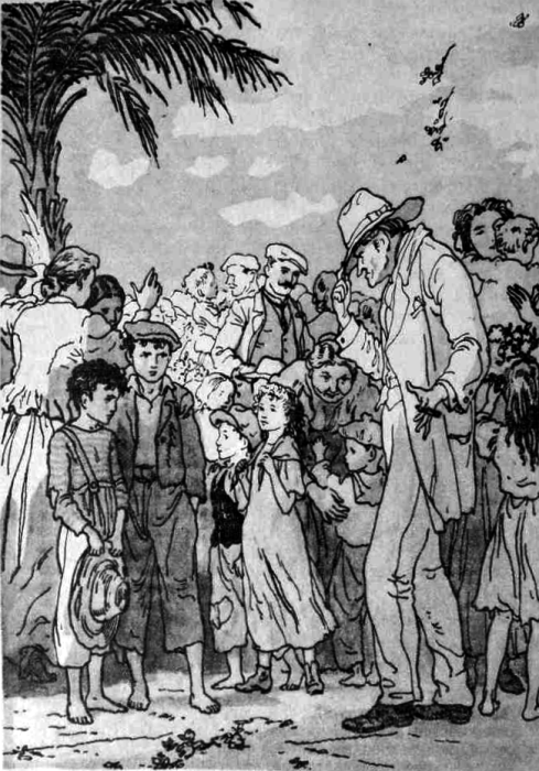 Из-за колонн вокзала идёт стройная процессия маленьких людей, они полуодеты и кажутся мохнатыми в своих лохмотьях, мохнатыми, точно какие-то странные зверьки. Идут, держась за руки, по пяти в ряд очень маленькие, пыльные, видимо усталые. Их лица серьёзны, но глаза блестят живо и ясно, и, когда музыка играет встречу им гимн Гарибальди, по этим худеньким, острым и голодным личикам пробегает, весёлою рябью, улыбка удовольствия.
