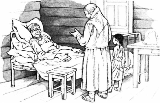 Потом они зашли к Дарье Карпушихе. Подруги с молодости, сейчас Олхон и Дарья виделись редко. Третий год Карпушиха недвижно лежала на кровати: ревматизм согнул и иссушил её. Девочку здесь всё пугало: маленькая тёмная комната с одним окном, почерневшая икона с лампадкой, горящей голубоватым немигающим огнём, железная узкая кровать с горой разноцветных пуховых подушек и костистое тело тётки Дарьи с неправдоподобно большими руками. Казалось, что руки не её, а принадлежали другой женщине великанше, до того были широки ладони с потемневшей и грубой кожей.