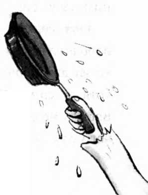 Миссис Ворчунья вскинула руки, защищаясь, как вдруг поняла, что у неё есть прекрасное оружие против летающих ежей. Она ударила Колючку сковородкой, и чучело отскочило от неё, как мяч от теннисной ракетки у опытного игрока.