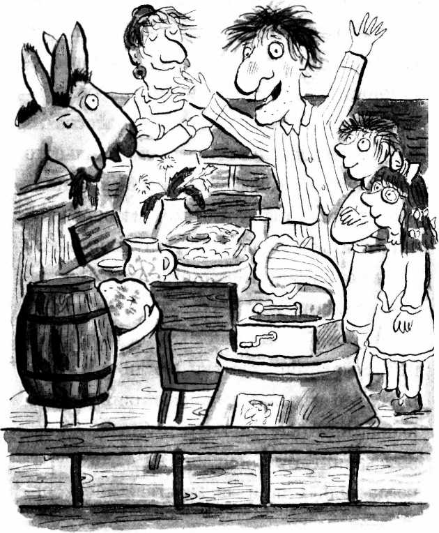 угощениями. Миссис Ворчунья, Лучик и Мими принесли его из фургончика вместе с четырьмя стульями и жестяным тазом, который они перевернули и сделали подставкой под граммофон. (На нём крутилась очень старая и очень исцарапанная пластинка с тоскливой песней о пропавшем голубе.)