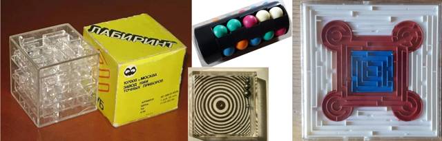 Вова выложил на стол четыре квадратных пластмассовых коробочки с «Игрой пятнадцать»*, две «Четыре по четыре»**, цилиндрик с проворачивающимися рядами, в котором полагалось расставлять шарики по цветам (иногда его ещё называли «светофор», хотя цветов было сильно больше, чем три), игру на ловкость «Мишень»***, большой квадратный плоский лабиринт с шариком и на закуску шикарный многоэтажный лабиринт-кубик.