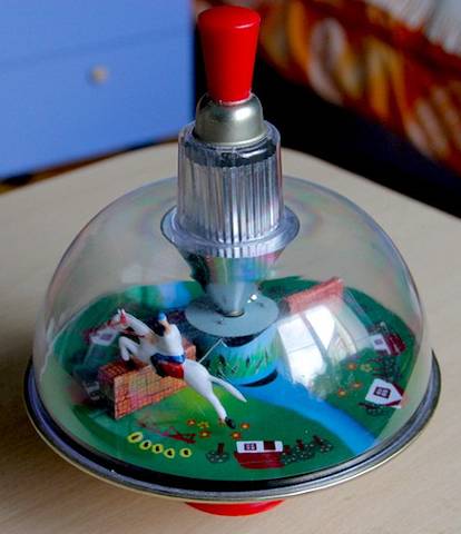 Из рюкзака показалась слегка помятая коробка, а из неё юла, но не простая, а с полукруглым стеклянным куполом, под которым была нарисована пересечённая местность, протекающая через центр речка, и даже установлены два перпендикулярных речке заборчика. Сбоку на тонкой проволочке торчал всадник на белой лошадке. Мы раскрутили юлу, и всадник помчался вперёд, перескакивая через речки и заборы.