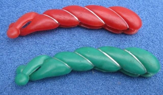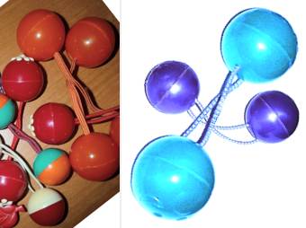 И вот, если вы помните, народу потихоньку разрешили кустарщину. И нынешней весной появилось такое вот чудо! Шарики для волос. Проще говоря, это были два куска всё той же резинки для трусов (только волшебным образом разноцветной), вделанных в два шарика по краям. Самые первые по виду вообще напоминали погремушки, но я уже была рада и хвостики они держали неплохо, и какая-никакая красота. Потом пошли кирпично-красные, и были они у всех. А таких, как Вова привёз, я в этом варианте событий ещё не видела из яркой, переливающейся перламутром пластмассы и с резинкой круглой, типа шляпной. Шарики шли двух размеров, большие и маленькие. Вова наделил всех (кроме бабушки, понятное дело): две пары таких и две таких. Мне достались маленькие ярко-красные, похожие на вишни, и большие небесно-голубые. Всё, буду хвосты менять, форсить.