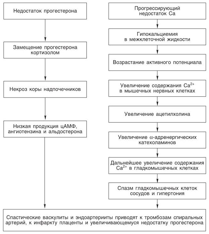 Что касается патофизиологии гестоза, то можно выделить две различные, но взаимосвязанные фазы: к 1 й ф а з е относятся изменения, возникающие в I половине беременности и происходящие в результате истощения коры надпочечников; 2 я ф а з а это изменения, происходящие главным образом вследствие прогрессирующей недостаточности Са во II половине беременности.