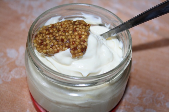 Для соуса: 2 столовые ложки конопляного или орехового масла, 1 зубчик чеснока, 0,5 чайной ложки горчицы из зерен, 0,5 чайной ложки красного фруктового уксуса, ¼ чайной ложки меда, 1 чайная ложка рубленой пряной зелени. Кроме того: несколько маринованных корнишонов.