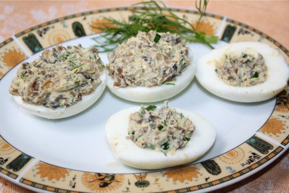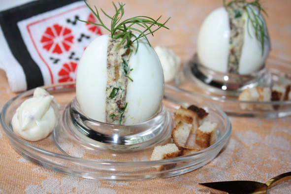 Яйца отварить, очистить, разрезать вдоль пополам, вынуть желтки. Желтки размять вилкой, добавить грибы с луком, рубленую зелень, 1 чайную ложку майонеза, перемешать. Приготовленным фаршем заполнить половинки яиц. Фаршированные половинки сложить попарно, в форму целого яйца, посыпать перцем чили. Яйца установить в подставки, приправить приготовленным майонезом.