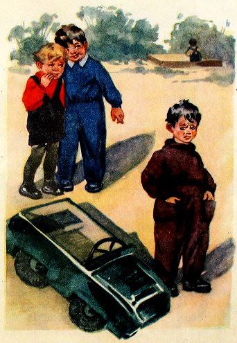 Сережа вылез и, едва не плача, смотрел, как мимо легко и свободно, весело гудя, проносились на своих новеньких, блестящих на солнце автомобилях Коля, Витя и Петя.