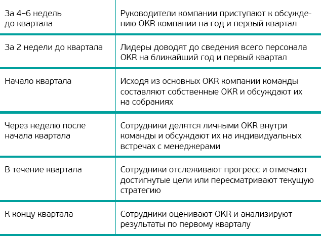 OKR не должны быть «высечены в мраморе». Даже после окончания официальных обсуждений сотрудники и команды должны иметь право корректировать цели и синхронизировать их между собой. То же касается и рыночной ситуации: если что-то меняется и цель теряет свою актуальность, можно модифицировать ключевые результаты или вовсе отказаться от дальнейшего движения в выбранном направлении.