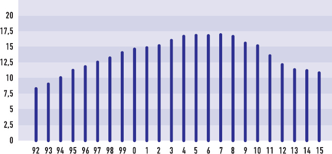 ПРОДАЖИ КНИЖНЫХ МАГАЗИНОВ В США С 1992 ПО 2015 (В МЛРД ДОЛЛАРАХ США)[33]