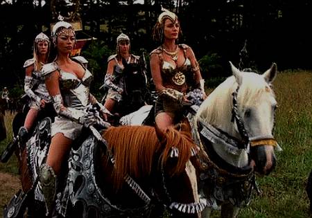 Вдруг впереди послышались звуки. Кто-то приближался, и судя по всему не один. Эллес решила, что лучше не рисковать. Кто его знает Она кинулась к лесу и скрылась за широченным дубом. А в полусотне метров уже показались всадники. Точнее всадницы. Шесть девушек на конях. Они выехали по лесной дороге и неспешно продвигались вдоль берега. Выглядели девушки внушительно. Было ясно, что это воины. Торс защищен блестящими доспехами, на голени стальные поножи, на головах шлемы. У каждой сбоку меч или боевой топор, за плечом длинный лук и колчан со стрелами. Все рослые, мускулистые. Впечатляющее зрелище.
