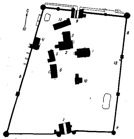 надвратная церковь. 10. Звонница. 11. Братский корпус. 12. Келья Иринарха-затворника.