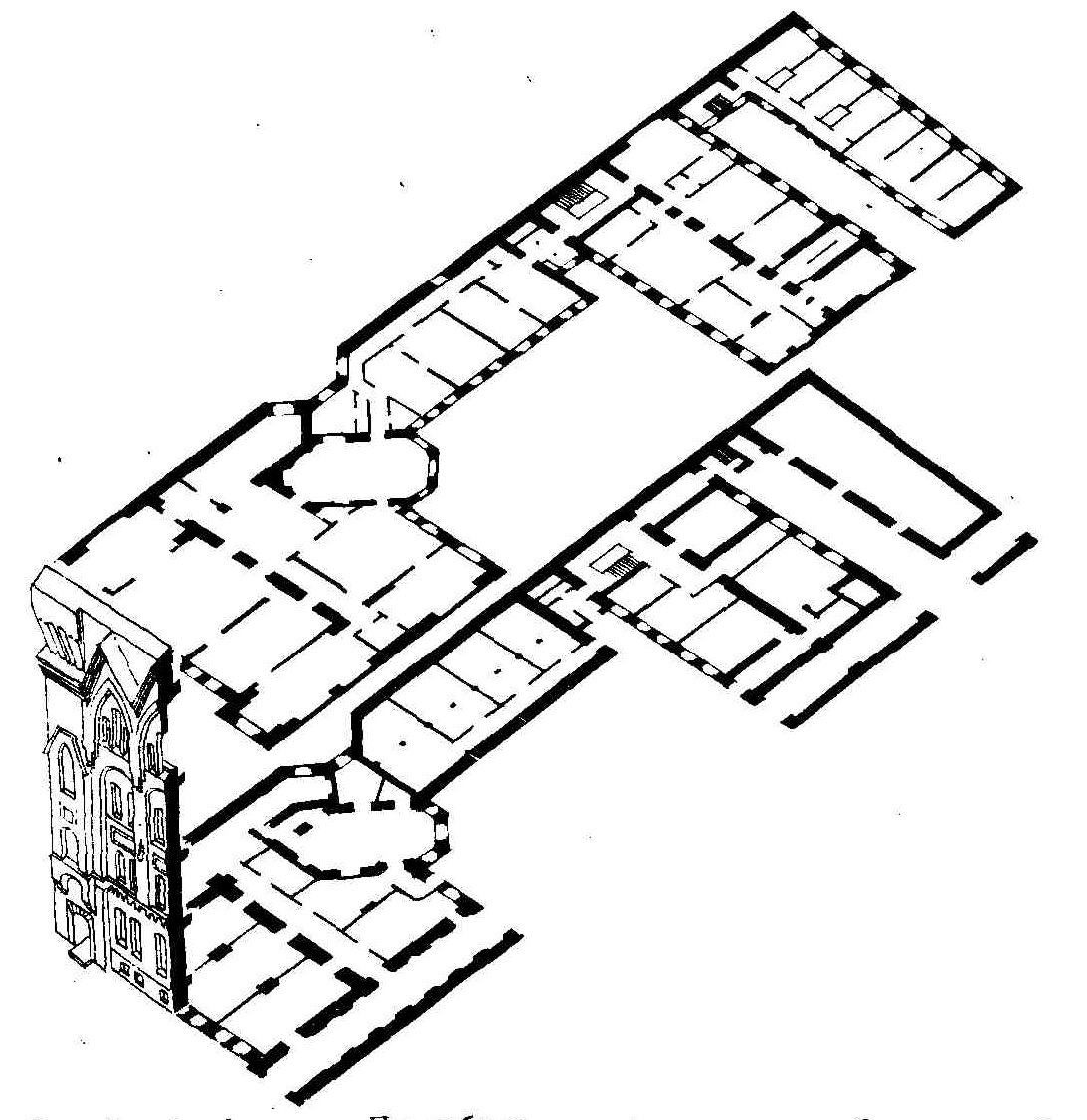 33. Доходный дом. Петербург. 1872 год. Архитектор В. А. Шретер. Совмещенное изображение. Фасад, планы первого и четвертого этажей