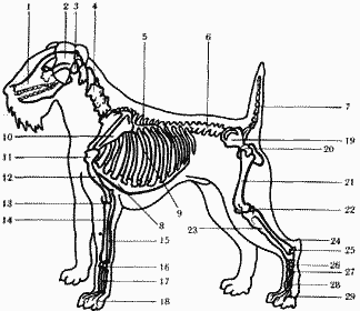 Осью скелета собаки (рис. 1) является позвоночный столб, на переднем конце которого находится череп, а по сторонам ребра и конечности.
