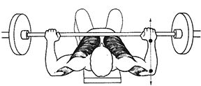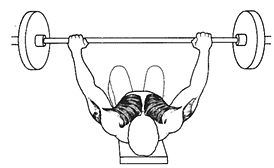 Выполнение: (1) Лягте спиной на горизонтальную скамью, упершись ногами в пол для равновесия. Хват должен быть средним (это означает, что, когда вы опускаете штангу к груди, ваши руки должны быть расставлены достаточно широко, чтобы предплечья занимали вертикальное положение, перпендикулярно полу). Снимите штангу со стойки и удерживайте ее на вытянутых руках.