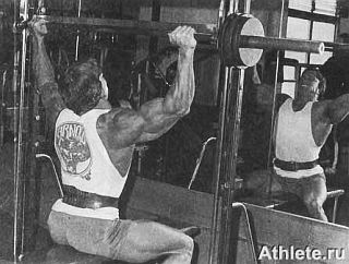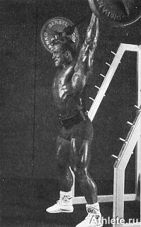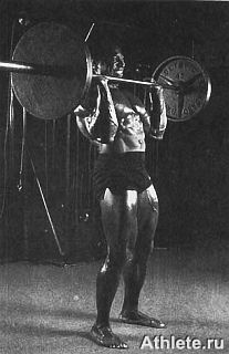 Выполнение: (1) Сядьте на корточки, наклонитесь вперед и возьмите штангу верхним хватом, руки на ширине плеч. (2) Выпрямив ноги, поднимите штангу на высоту плеч, затем немного прогнитесь назад для поддержки снаряда в исходном положении армейского жима. (3) Пользуясь мышцами плечевого пояса и предплечья, выжмите штангу над головой, затем опустите ее на высоту плеч и повторите движение в обратном порядке, согнув колени и положив штангу на пол.