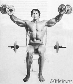 (2) Выжимайте снаряд вверх, пока руки не выпрямятся полностью, затем медленно опустите его в исходное положение. Вы также можете пользоваться тренажерами для жимов с перекрестным хватом или жимов штанги из-за головы, когда разрабатываете передние и боковые дельтовидные мышцы.