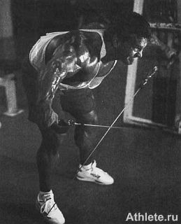 Выполнение: (1) Пользуясь двумя блочными устройствами, возьмитесь за рукоятки и держите руки скрещенными перед собой (левая рука держит рукоятку правого троса, правая рука рукоятку левого троса). Наклонитесь вперед так, чтобы ваше туловище было почти параллельно полу. Старайтесь не выгибать спину.