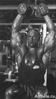 Выполнение: Встаньте, опустив руки с гантелями вдоль туловища. (1) Поднимите одну гантель вверх и вперед по широкой дуге выше головы. (2) Плавно опустите гантель, полностью контролируя движение, и одновременно поднимите другую гантель, чтобы обе руки находились в движении и гантели разошлись в противоположных направлениях перед лицом. Для непосредственного воздействия на переднюю головку дельтовидной мышцы следите за тем, чтобы гантели проходили прямо перед лицом, а не сбоку. Выполняя такое же движение со штангой, возьмитесь за гриф верхним хватом. Поднимите штангу на вытянутых руках и поднимите ее чуть выше головы; затем вернитесь в исходное положение.