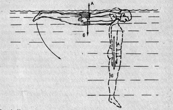 Центр тяжести человеческого тела, лежащего в воде (рис. 1), находится на уровне первого-второго крестцовых позвонков, а центр объема на несколько сантиметров ближе к голове. Поэтому в горизонтальной позе с руками, лежащими вдоль туловища, ноги все время стремятся опуститься, и это продолжается до тех пор, пока тело не займет почти вертикальное положение и центр тяжести не окажется под центром объема. Это движение ног вниз увлекает пловца с головой под воду, но погружение можно приостановить, слегка поработав ногами, как в стиле кроль или по типу «велосипеда», а можно совершать легкие толчковые движения руками, что, правда, уже требует от человека каких-то усилий и исключает полный отдых и неподвижность.