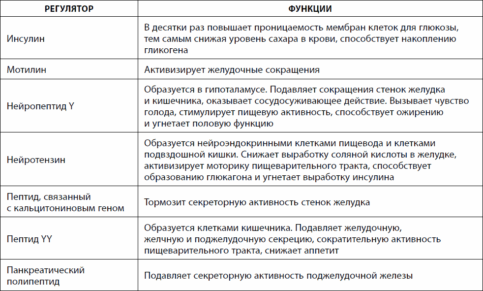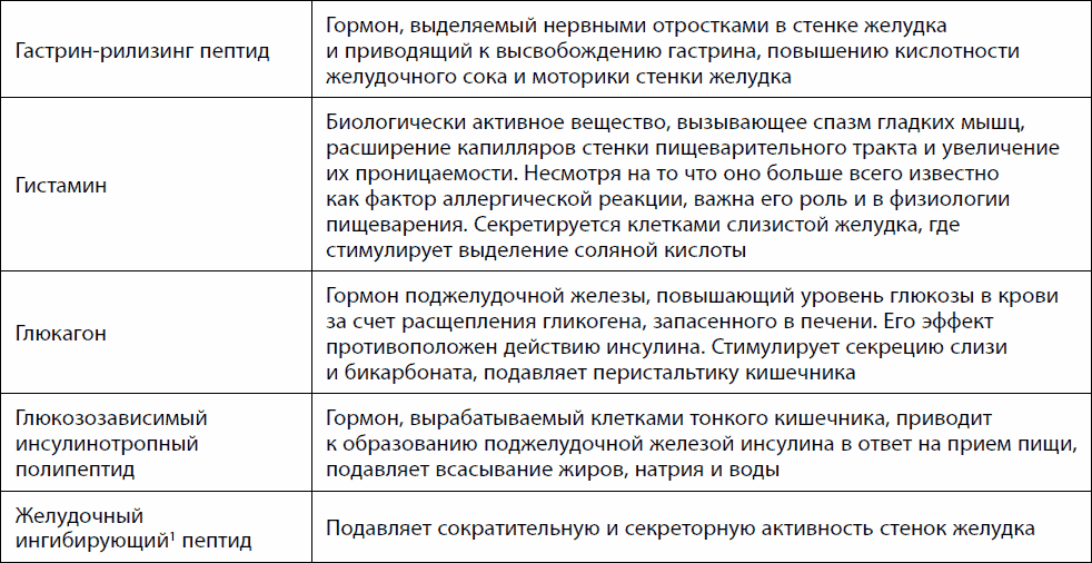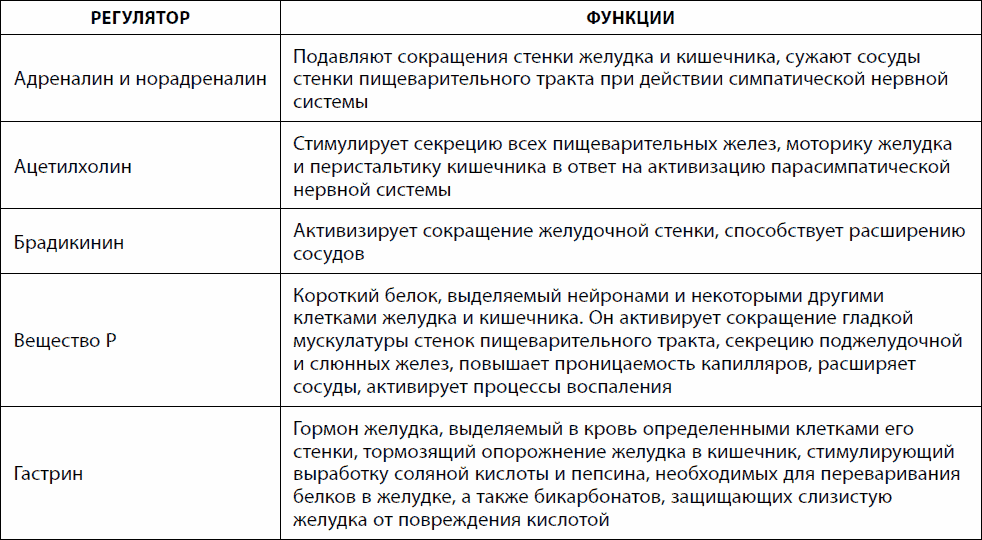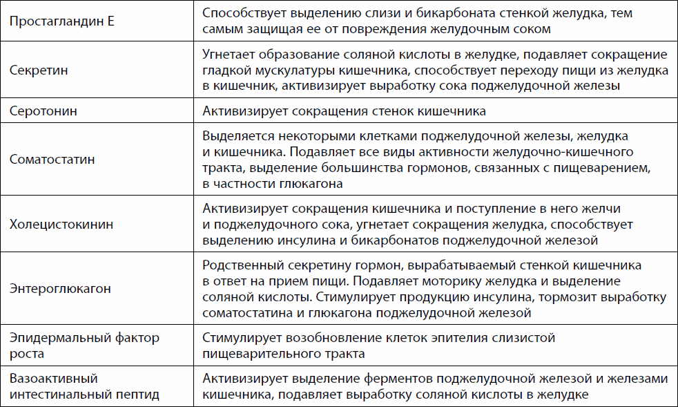Регуляцию разнообразных функций желудочно-кишечного тракта осуществляют различные биологически активные вещества нейромедиаторы, гормоны, факторы роста, которые выделяются нервными и эндокринными клетками как самой пищеварительной системы, так и за ее пределами. Существует не менее трех десятков гормонов и гормоноподобных веществ, регулирующих функцию пищеварительной системы (таблица).
