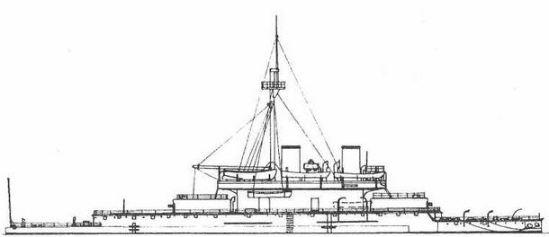 Наибольший угол крена этого броненосца, при полном ходе и руле на борт, простирался до 5°.