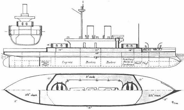 у ватерлинии 14 дюймов, постепенно утоняясь до 8 дюймов к носовой и кормовой оконечностям и к своему нижнему краю ниже ватерлинии. Этот броневой пояс возвышается на 4 фута над грузовой ватерлинией, т.е. до высоты верхней палубы судна, и опускается ниже ватерлинии по средине борта на 5 ф 7 дм, в корме несколько меньше, а в носу ниже шпирона, служа последнему прочной опорой на случай таранения.