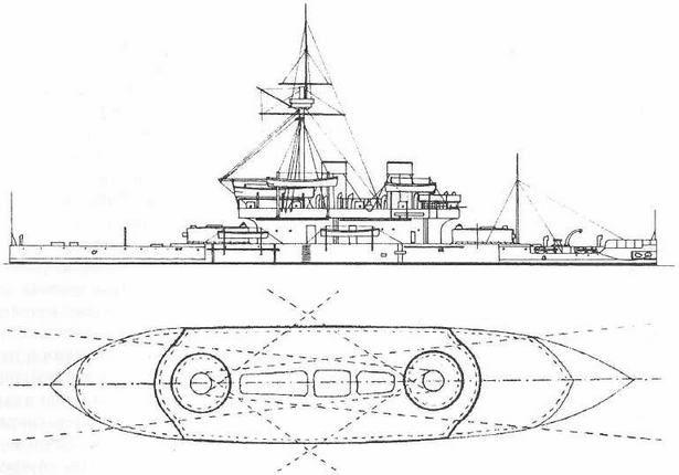 Двухбашенный брустверный монитор Dreadnought". 1877 г. (Наружный вид и вид сверху с указанием секторов обстрела) Из книги О. Parkes British Battleships. London. 1966.