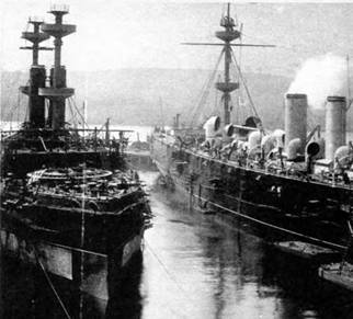 Паровая машина, изготовленная для броненосца *Юпитер* (вверху) Броненосец Юпитер во время достройки. 1896-1897 гг. (2 фото внизу)