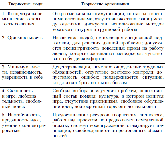 Творчество может быть также результатом целенаправленной организационной деятельности. Большинство компаний ценят креативных сотрудников и часто ведут поиск одаренных специалистов. Однако творческими способностями обладают не только гении, но и рядовые сотрудники. Учитывая это, менеджеры должны создавать такую рабочую среду, где в полной мере реализовывался бы творческий потенциал компании и ее персонала. В табл. 1.3 показано, как характеристики креативных организаций корреспондируют с характеристиками креативных сотрудников. Такие организации имеют гибкую структуру. Люди действуют в условиях неопределенности, их задания и обязанности установлены нечетко, отсутствуют жесткие границы между отделами, и большая часть работы выполняется в командах. В корпоративной культуре ценятся склонность к игре, свобода, вызов, соучастие персонала в решении проблем. Творческие организации стремятся использовать весь внутренний потенциал для нахождения новых идей. Многие управленческие программы направлены на то, чтобы стимулировать творческое мышление и инициировать изменения. Работа сотрудников разнообразна и лишена рутины.
