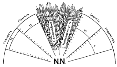 Дополненная эта фигура может дать вам довольно ясное и точное понятие о способностях N. N. Вы увидите, что при всей хитрости и остроте своей он часто должен ошибаться по недостатку здравого рассудка и сметливости. При взгляде на чрезмерное количество самолюбия, напыщенностии нераздельного с ними упрямствавам не покажется удивительным, что три эти качества, составляющие в сложности 35 градусов, во всех случаях будут превозмогать здравый рассудок, проницательность, понятливость и сметливость N. N., которых у него всего-на-все только 14 градусов.