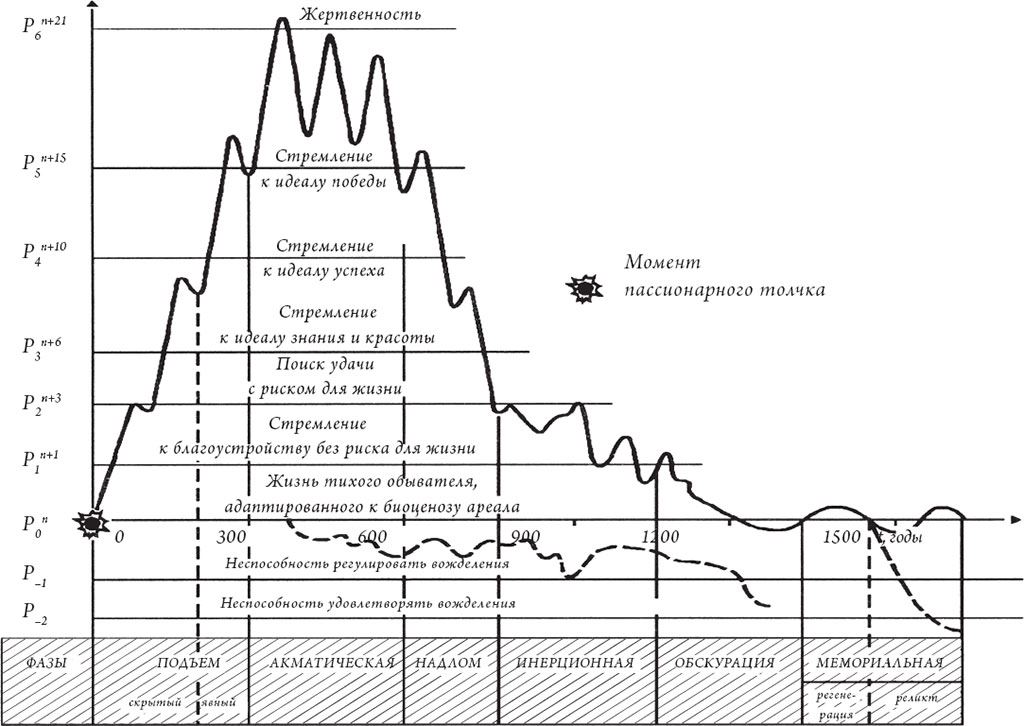 Pki уровень пассионарного напряжения системы. Качественные характеристики этого уровня («жертвенность» и т. д.) следует рассматривать как некую усредненную «оценку» представителей этноса. Одновременно в составе этноса есть люди, обладающие и другими отмеченными на рисунке характеристиками, но господствует один тип людей;