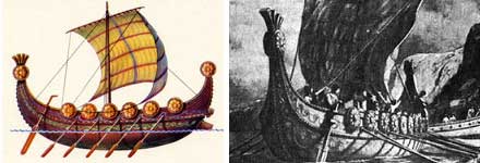 С виду оно здорово драккар викингов напоминает. Если бы ещё и обшивка была внакрой, а не вгладь так вообще было бы трудно отличить. Ну, если точнее, то не "длинный" драккар, а грузовой кнорр, который попузатее и повысокобортнее, но тоже со вполне обтекаемыми обводами. Таран и у этого этрусского судна есть, но небольшой и в глаза особо не бросающийся. "Пирата" лёгонького он потопит, а вот против настоящего военного судна слабоват, против той же триремы ловить нечего, так что не выглядит он военным прибамбасом. А "биремность" его тоже замаскирована. Нет у него никакого второго яруса вёсел.