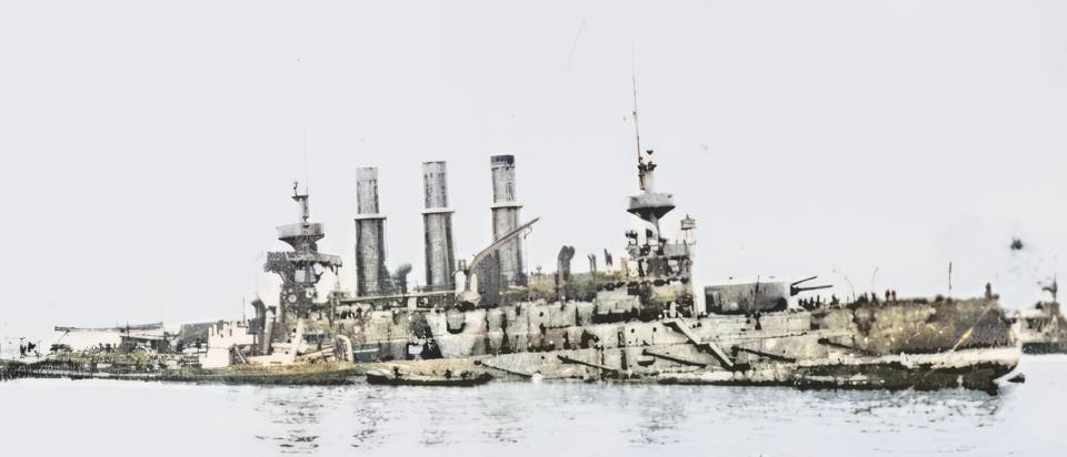 Сука, чот ваще тут всё тухло! В проливе у Маяка как торчал, так и торчит, сидящий на пузе у отмели, «Ретвизан». С кессоном и дыркой. Точнее сначала с заработанной 27 января огромной дыркой от джапской торпеды, а потом уже с матами сооружённым деревянным кесонном вокруг этой дырки.