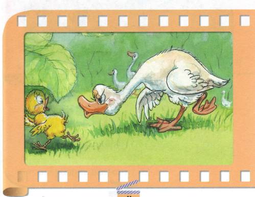 Большой белый Гусь сердито посмотрел на Цыплёнка и зашипел: