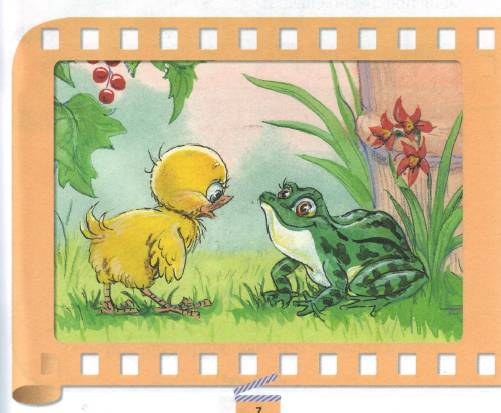 Большая зелёная Лягушка сидела у кадки с водой, таращила на Цыплёнка свои большие круглые глаза и квакала: