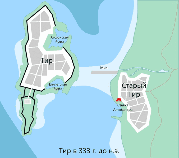 Македоняне взялись за работу. Они вбивали сваи в податливое илистое дно, укрепляли их камнями. Камней нужно было много, очень много. Александр повелел разрушить Старый Тир. Работа велась с большим рвением. Царь ежедневно посещал и осматривал мол. Он не подгонял своих воинов, требуя от них не спешки, но надёжности сооружения.