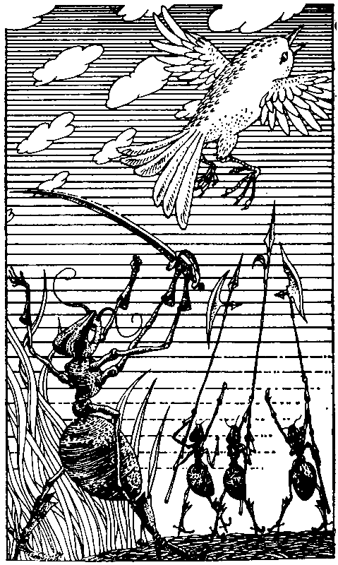 Воодушевленные его примером, остальные рыжие кинулись вслед за ним. По ногам соловья они, как матросы по корабельным мачтам, мигом вскарабкались до туловища прожорливой птицы. Здесь они зарывались ей в пух под крылья,, под шею, впивались ей в кожу, в мясо.